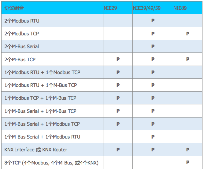 NIE亦有不同點數規模的選擇,包括NIE29,NIE39和NIE49可處理2500點對象,NIE59處理5000點對象,NIE89處理10000個對象點。由于不同型號的NIE所具備的串口數量不同,因此當它們裝載兩種協議驅動時,具有如下組合規律: