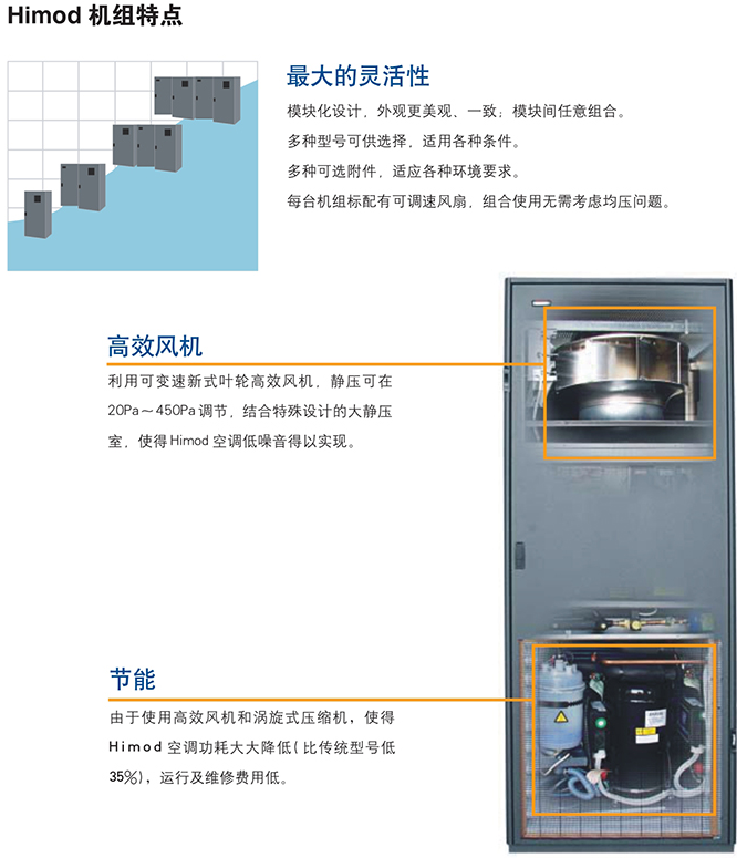 同時采用彌漫式送風方式,獲得最優性能的同時,節省用戶投資,最大限度降低機房層高要求插入式風機、大面積蒸發器、渦旋式壓縮機、優化的制冷系統使節能性能顯著提高